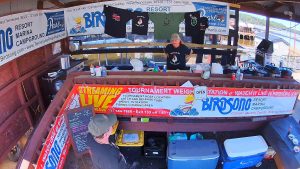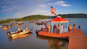 Our entire facility is perfectly suited for fishing tournaments up to 300 boats. We are proud to offer: 1) a 200 foot walkway that allows fishermen to tie off their boat while they weigh in; 2) the covered weigh-in pavilion affords protection from the elements at weigh-in time and has a live-release tube; 3) large overflow free parking area; 4) security lighting at ramp for after-hours boat loading/unloading; 5) our main free parking area is black topped with a restroom; 6) the concrete ramp is 55 feet wide and can accommodate up to three fishermen loading/unloading at one time; 7) we have 50 covered boat slips with electric and 24 hour security cameras for those fishermen that want to come ahead of tournament time and dock their boats. Call us at 731-584-7880 to reserve; 8) we also have large, oversized boat slips for houseboats and pontoons. 9) Live video feed that can be viewed worldwide for the weigh in and blast off; 10) Blast off location has a 15 foot covered gazebo with a picnic table, American flag and pole suitable for the staging area.